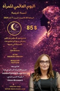 بمناسبة اليوم العالمي للمرأة، تنظم السيدة هنادي سعد ومطعم جار القمر (Voisin de la Lune) أمسية تكريمية خاصة، وذلك مساء السبت 7 آذار (مارس) 2026 عند الساعة 8:30 مساءً، في مدينة المطعم المذكور في لافال.