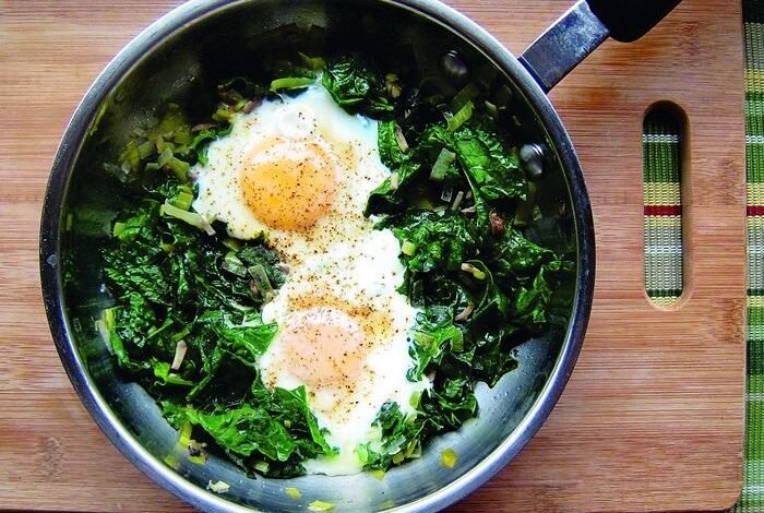 – ضعوا السبانخ في المقلاة ثم خففوا الحرارة، وقلبوها حتى تذبل، ثم ضعوها في جانب واحد من المقلاة، وضعوا القليل من الزيت ثم أضيفوا البيض واطهوه حتى ينضج.