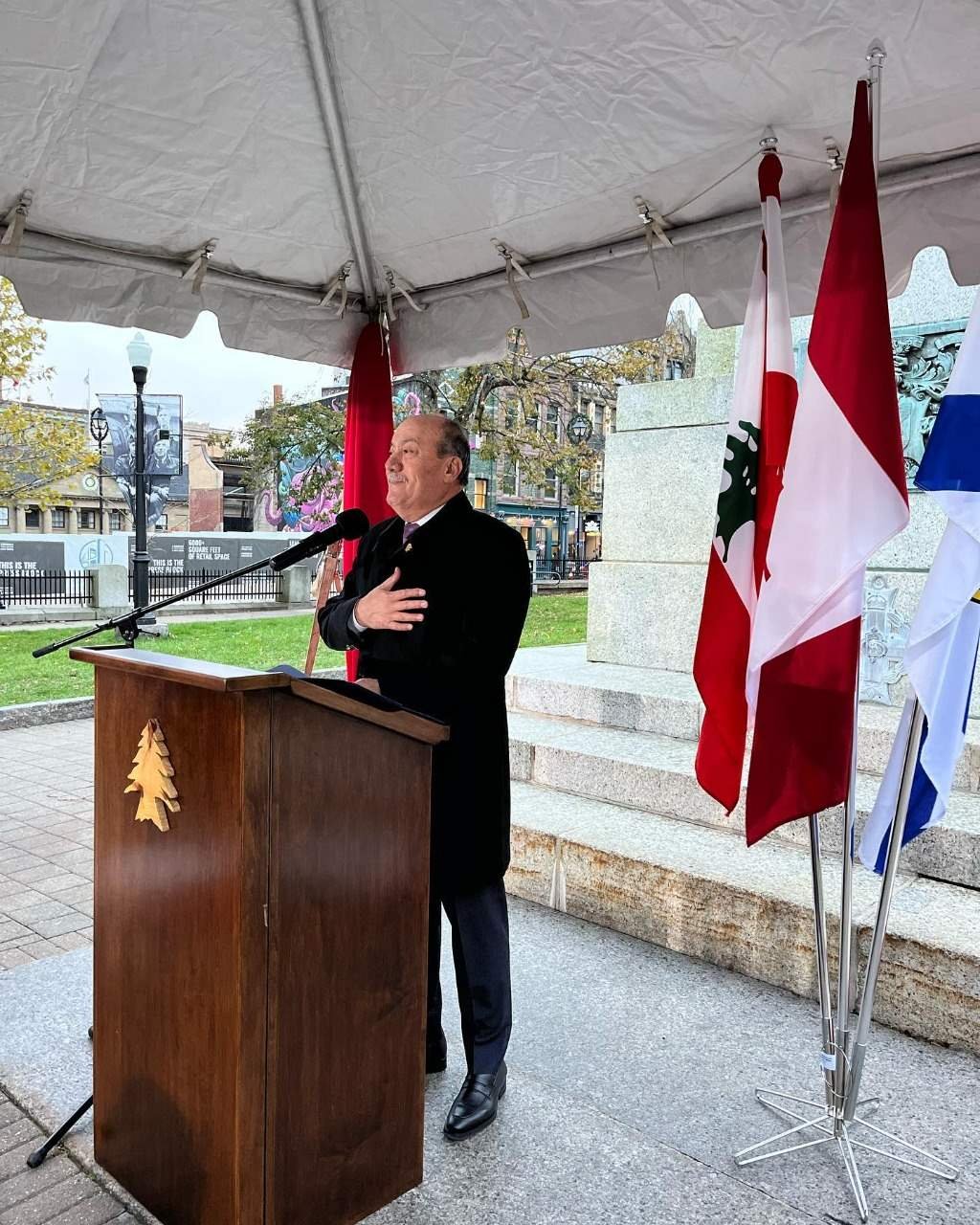 بعد رفع العلم الّلبنانيّ والنشيدين الوطنيّين الكنديّ واللّبناني تحدّث القنصل فارس شاكرًا الجميع على حضورهم على الرغم من البرد القارس وأضاف: “إنّ رفع العلم اللبنانيّ، في هذا المكان والزمان، ملائمٌ جدًا، فهو يعكس الروابط القويّة بين مجتمعنا وهذه المدينة والمقاطعة العظيمة التي نسمّيها موطننا منذ أكثر من 125 عامًا، كما هو تذكار للجميع بأنّ ما يجمعنا أكثر بكثير ممّا يفرّقنا. كذلك نجتمع أيضًا خلال شهر التراث اللبنانيّ الذي أنشأته مقاطعتنا في عام 2018 تقديرًا للمساهمات العديدة لجاليتنا في تحسين المشهد الثقافي والإقتصاديّ والدينيّ والسياسيّ في “نوفا سكوشا”.