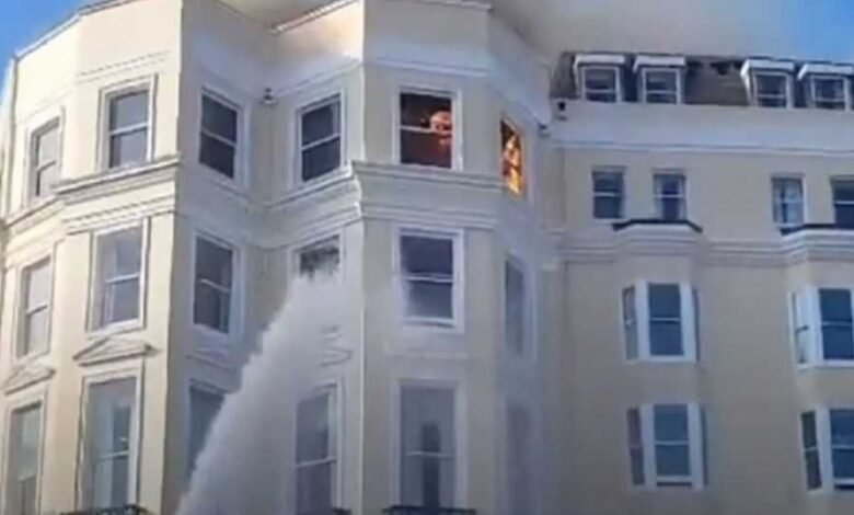حاول رجال الإطفاء في بريطانيا إخماد حريق نشب بفندق عمره 200 عام، يقع على الواجهة البحرية في برايتون جنوب شرقي البلاد, حيث تم إرسال 15 سيارة إطفاء إلى مكان الحادث في فندق رويال ألبيون، وسط رياح شديدة صعبت على فرق الإطفاء العملية.