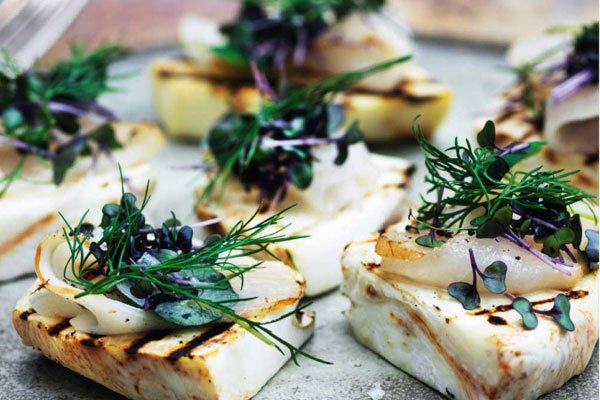 طبق اليوم نباتي بلمسة ثمار البحر. وهو بسيط وسهل التحضير. إنه الكرفس المشوي مع السمك المدخن.