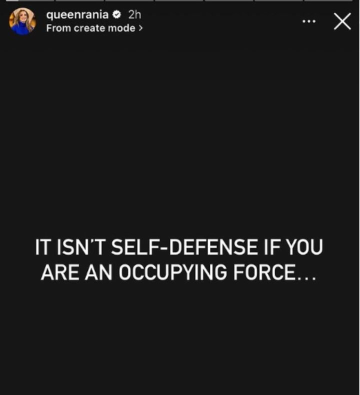 وكتبت الملكة في “الستوري”: “لا يمكن اعتباره دفاعا عن النفس إذا كنت قوة محتلة”، في إشارة إلى العمليات العدائية الإسرائيلية في غزة، وتحجج تل أبيب بأنها جاءت “دفاعا عن النفس”، على خلفية تنفيذ كتائب القسام هجوما واسعا ضد مستوطنات الغلاف.