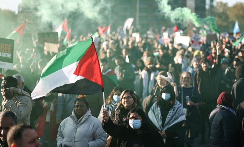 نظم عشرات المواطنين المؤيدين لفلسطين تظاهرة منددة بالحرب على قطاع غزة، أمام منزل الرئيس الأميركي جو بايدن في ولاية ديلاوير، حاملين الأعلام الفلسطينية ولافتات تدعو لوقف إطلاق النار، بحسب وكالة “روسيا اليوم”.