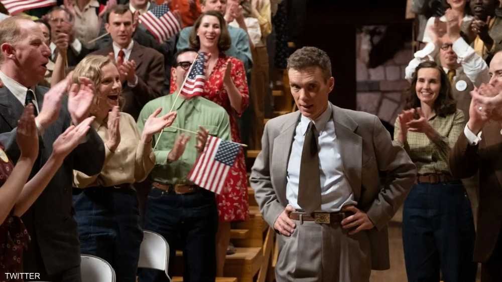 خلال إحدى اللقطات، وقف بطل الفيلم كيليان ميرفي، الذي يجسد دور أوبنهايمر، وسط حشد يصفق ويهتف من أجله وهم يلوحون بالأعلام الأميركية.