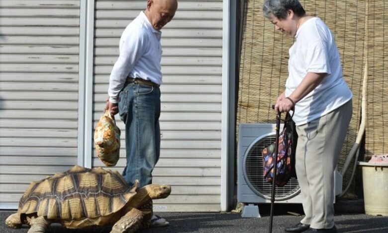 يعتني هذا المسن الياباني بهذه السلحفاة الأفريقية وكأنها حيوان أليف.
