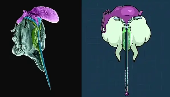 كذلك أظهر المقطع الشكل الذي تبدو عليه الحشرة عن قرب، مع ضخ السائل في جسم الضحية، حيث تتحرك شفرات الإبرة ذهاباً وإياباً وتضخ السم ويزيد تدفقها بشكل أعمق في الجرح حتى يفرغ كيس السم تماماً.
