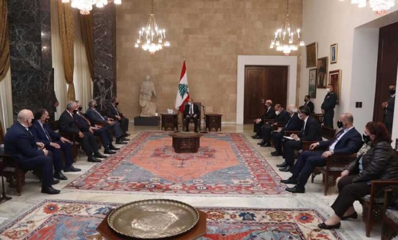 رئيس الجمهورية: ورد الرئيس عون مرحبا بالوفد، ولفت الى ان “الأزمات التي يمر بها لبنان متراكمة منذ ثلاثين عاما”، مشددا خصوصا على “الازمة الحكومية والازمة المالية الكبيرة التي تضرر بنتيجتها المقيمون كما أبناء الجالية في الاغتراب”، مشيرا الى ان “تأثر الازمة المالية بنتائج الحرب على سوريا بعد اغلاق معابر لبنان الحدودية وقطع تواصله مع الدول العربية، فضلا عن نزوح حوالى مليون و850 الف سوري ما شكل عبئا كبيرا على لبنان”.