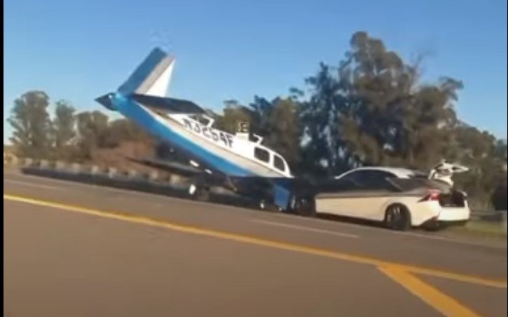 أظهر مقطع فيديو مرعب، تداولته وسائل إعلام أميركية، طائرة صغيرة تقوم بهبوط اضطراري وتصطدم بسيارة على الطريق السريع في كاليفورنيا.