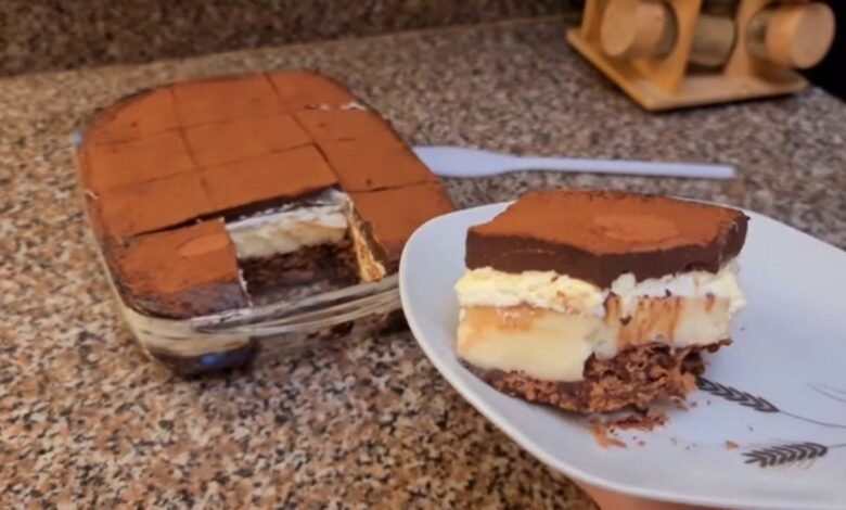 – بعد أن يشتدّ الخليط، نكسّر قطع البسكويت ونمزجها به، ثم نصبّه في صحن التّقديم.