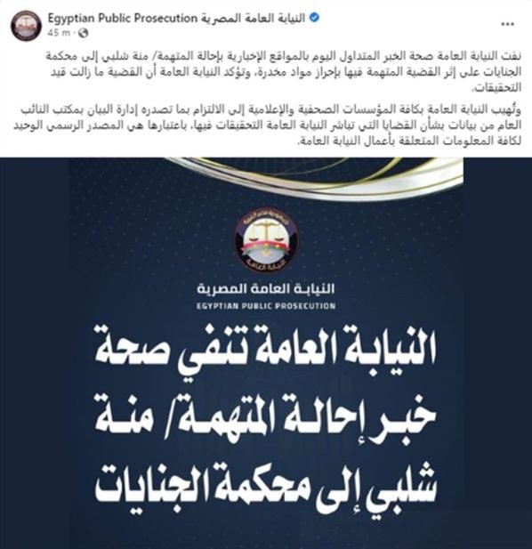 وفي بيان نشرته عبر حسابها بموقع فيسبوك، “نفت النيابة العامة صحة الخبر المتداول اليوم بالمواقع الإخبارية بإحالة المتهمة/ منة شلبي إلى محكمة الجنايات على إثر القضية المتهمة فيها بإحراز مواد مخدرة، وتؤكد النيابة العامة أن القضية ما زالت قيد التحقيقات”.