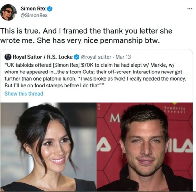 وعلق ريكس على الأمر عبر حسابه بموقع تويتر: “هذا صحيح، لقد قمت بتأطير رسالة الشكر التي كتبتها لي. لديها خط جميل جدًا بالمناسبة”، وذلك في إشارة إلى تلقيه رسالة شكر على موقفه هذا من ميجان ماركل.