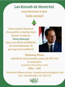 وفي المناسبة يدعو حزب الكتائب مونتريال المناصرين والاصدقاء للمشاركة في سهرة لا تُنسى تجمع بين الأهل والأصدقاء في كندا، على خطى التراث والالتزام الوطني.