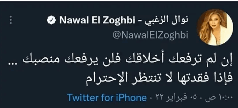 وكتبت نوال تغريدة على حسابها الرسمي على موقع التواصل الاجتماعي تويتر قالت فيها: “إن لم ترفعك أخلاقك فلن يرفعك منصبك، فإذا فقدتها لا تنتظر الاحترام”.