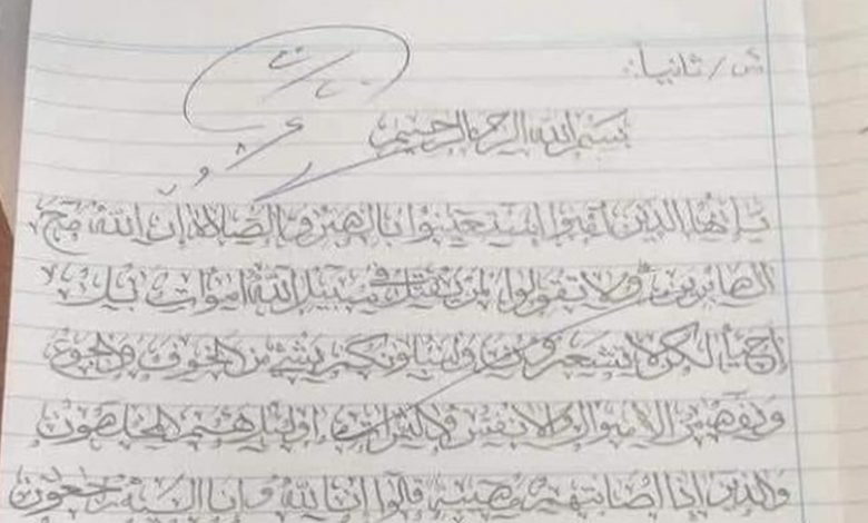 ورقة امتحان تخطف الأنظار.. طالب عراقي يكتب آيات من القرآن الكريم بخط “الثلث”