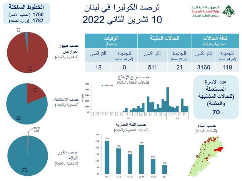 أعلنت وزارة الصحة العامة في تقرير عن حالات الكوليرا في لبنان، عن “تسجيل 21 إصابات جديدة رفعت العدد التراكمي إلى 511، فيما لم يتم تسجيل اي حالة وفاة وسجل العدد التراكمي للوفيات 18”.
