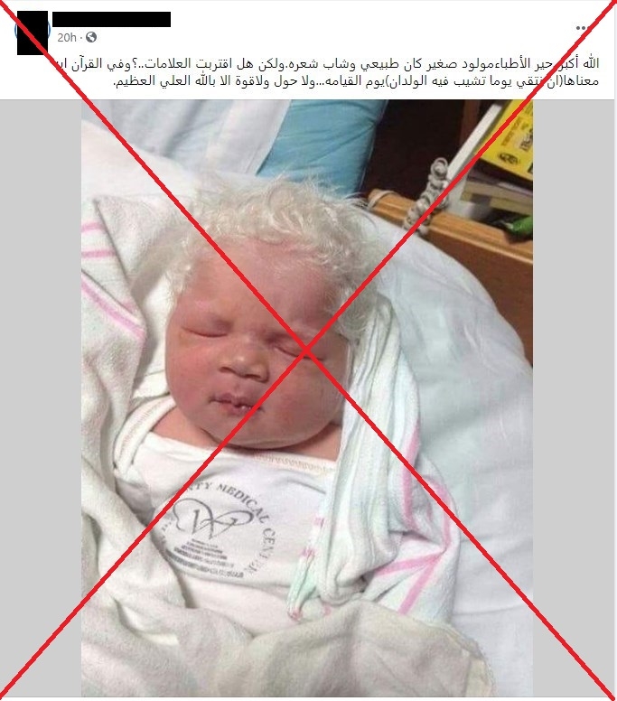 ظهرت على مواقع التواصل الاجتماعي، باللغة العربية، صورة لطفل شعره أبيض قيل إنه “ولد طبيعياً ثم أصابه الشيب”، في ما رآه البعض دليلاً على “اقتراب نهاية الزمن”. لكن هذه الصورة منقولة عن وسائل إعلام هنغارية ذكرت ان هذا الطفل ولد أصلاً بشعر أبيض بسبب اختلال في الصبغيات.