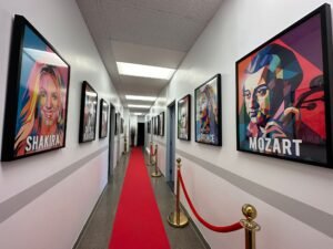 صور عمالقة بالفن الشرقي والغربي تزين جدران احدى القاعات رسمت بعناية واسلوب خاص يماهي طموحات الفنان المتنوع العطاءات، فها هنا التقت بيونسيه بالسيدة ام كلثوم وشارل ازنافور بالسيدة فيروز وغيرهم من فنانين طبعت اعمالهم في ذاكرة حاتم هم الذين سيشهدون على تطور معارف طلاب الاكاديمية خلال اوقات الدروس والمقررة من الساعة العاشرة صباحا حتى التاسعة مساء على مدار الاسبوع باستثناء الآحاد والاعياد حيث فرصة التفكير والراحة متاحة للجميع.