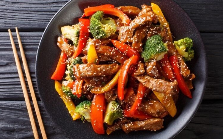 لحم بالبروكلي والفلفل الأحمر