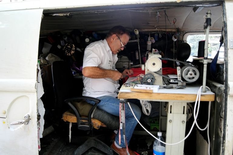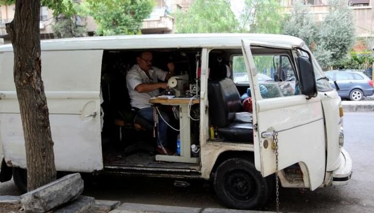 ويقضي المصري (65 عاما) أيامه في الخياطة وتركيب الأزرار وضبط قطع الملابس القديمة التي تحتاج إلى إصلاح وذلك في سيارته الفان المتوقفة على جانب أحد شوارع العاصمة دمشق.