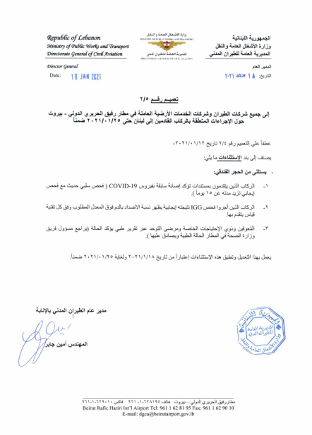 أصدرت المديرية العامة للطيران المدني، تعميماً جديداً حمل الرقم 2/5، إلى جميع شركات الطيران وشركات الخدمات الأرضية العاملة في مطار رفيق الحريري الدولي – بيروت حول الإجراءات المتعلقة بالركاب القادمين إلى لبنان حتى 25/1/2021 ضمناً.