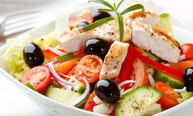 ضعوا الخس والبصل والخيار والبندورة والفليفلة الحمراء في وعاء التقديم مع الزيتون واخلطوا المكونات. بعدها أضيفوا الدجاج المشوي على الوجه.