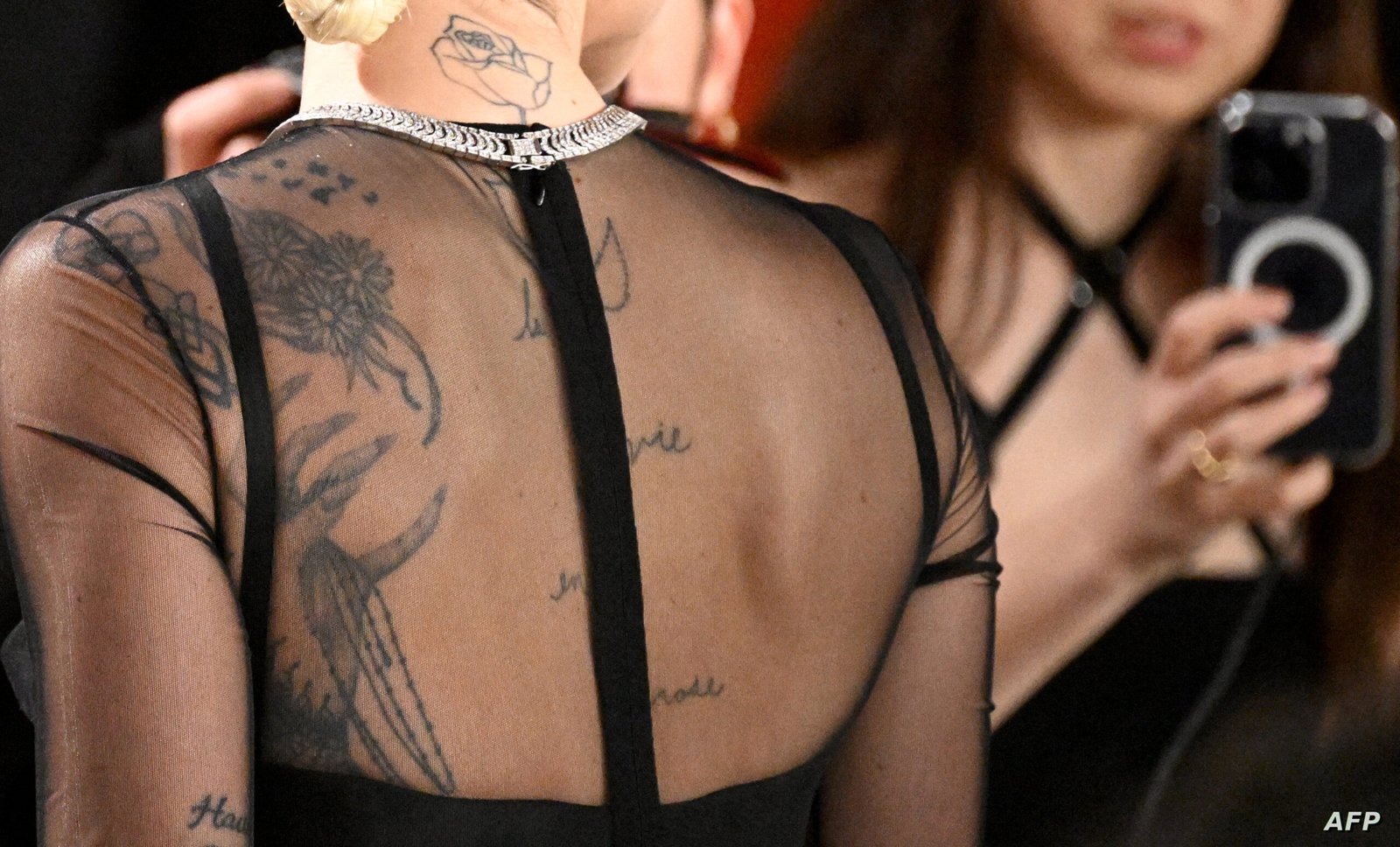 وفي ثوب أسود شفاف من فيرساتشي، عرضت ليدي غاغا ظهرها العاري.