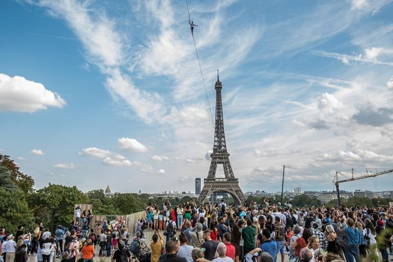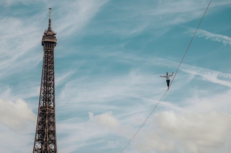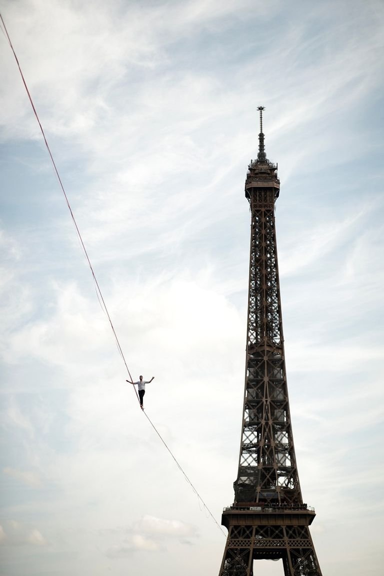 جاء ذلك عندما أكمل عبور مسافة 600 متر على حبل مشدود بين برج إيفل وبناية على الجانب الآخر من نهر السين.