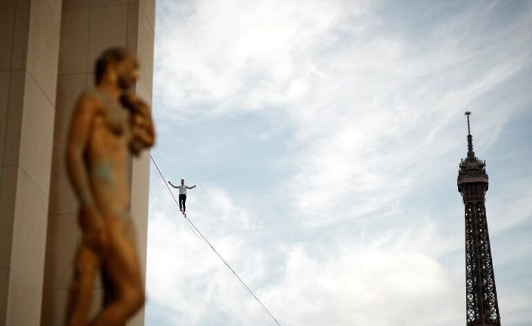 مغامر يمشي 600 متر على حبل.. استعراض باهر من برج إيفل