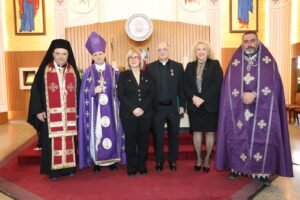 اليوم، يكتسب هذا الاحتفال دلالة خاصة، حيث يسرنا أن نرحب بضيوفنا الكرام الذين يشهدون على وحدة وأخوة مجتمعنا. نحن في غاية الفرح لاستقبال صاحب السيادة المطران ميلاد الجاويش الذي تفضل مشكورًا بالمشاركة في هذه المناسبة السعيدة. وجوده بيننا هو شهادة رائعة على الأخوة، ووحدة الكنيسة، وعلى تعميق شركتنا في الإيمان. ونحن أيضًا سعداء للغاية لاستقبال السيدة النائبة أني كوتراكيس، التي من خلال لفتة كريمة وعرفان، قامت بمنح ميدالية الملك تشارلز الثالث لأبينا العزيز إيلي. هذه اللفتة النبيلة لا تشهد فقط على التقدير الشخصي، بل تحتفل أيضًا بإلتزام وتفاني مجتمعنا كله في خدمة الله وإخوتنا وأخواتنا.