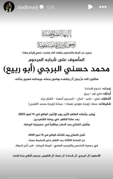 زياد اكتفى بالإعلان عن وفاة شقيقه عبر خاصية “الستوريز” على حسابه الرسمي في إنستغرام، حيث شارك النعي باسم العائلة، دون الكشف عن أي تفاصيل حول سبب الوفاة، مكتفيًا بذكر أسماء أشقائه وشقيقاته، من بينهم اسمه “زياد”، مع عبارة “المأسوف على شبابه”، ما عكس حجم الفقد وأثره المؤلم.