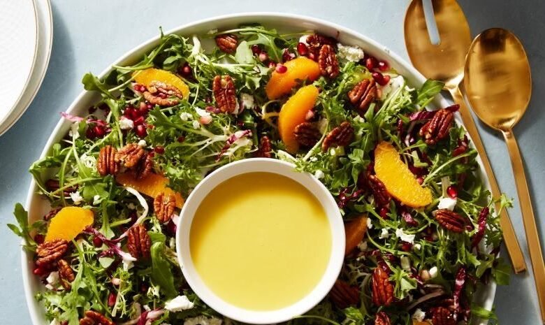 – للتقديم، انثروا البقان بالعسل وشرائح البرتقال وبذور الرمان وجبنة الفيتا فوق إكليل الخس.