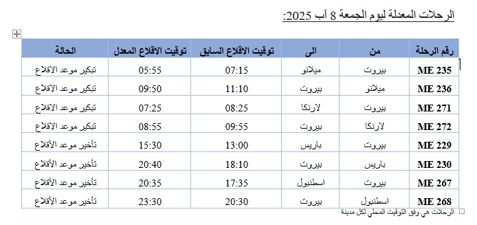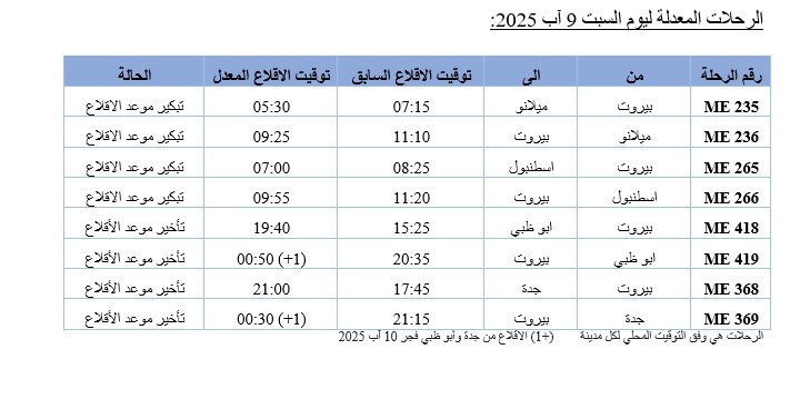 “تعلن شركة طيران الشرق الأوسط – الخطوط الجوية اللبنانية، عن تعديل بعض جدول رحلاتها ليومي 8 و9 آب وذلك لاسباب تشغيلية من باريس وميلانو واسطنبول ولارنكا وأبو ظبي وجدة، وإليها.