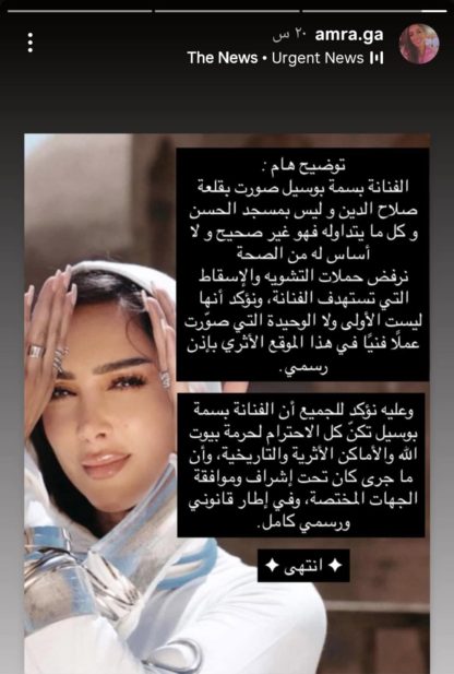 وكتبت والدة بسمة بوسيل، عبر خاصية الـ”ستوري” على حسابها بـ”إنستغرام”، “توضيح هام: الفنانة بسمة بوسيل صورت بقلعة صلاح الدين، وليس بمسجد الحسن، وكل ما يتداول فهو غير صحيح ولا أساس له من الصحة”، متابعة: “نرفض حملات التشويه والإسقاط التي تستهدف الفنانة، ونؤكد أنها ليست الأولى ولا الوحيدة التي صورت عملاً فنياً في هذا الموقع الأثري بإذن رسمي”.