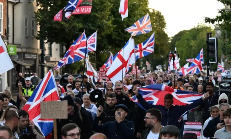 تظاهر أكثر من 110 آلاف شخص في وسط لندن، اليوم السبت، في مظاهرة نظمها تومي روبنسون، الشخصية البريطانية المعروفة بموقفها المناهض للهجرة والإسلام. واجتاحت حشودٌ الشوارع جنوب نهر التايمز، وصولًا إلى وستمنستر، مقر البرلمان البريطاني، ملوحين بالعلم البريطاني (علم الاتحاد)، وصليب القديس جورج الإنجليزي، بالإضافة إلى العلمين الأمريكي والإسرائيلي.