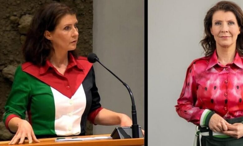 غادرت النائبة الهولندية إستير أوويهاند، زعيمة حزب من أجل الحيوانات (PvdD)، قاعة مجلس النواب بعد أن طُلب منها ذلك، إثر ظهورها مرتدية قميصا يمثل العلم الفلسطيني.