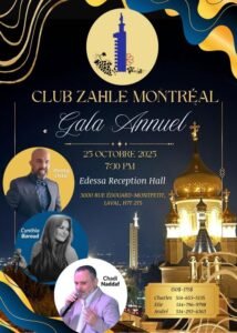 يُقيم نادي زحلة مونتريال برئاسة شارل ابو خاطر حفل عشائه السنوي في تمام الساعة السابعة والنصف من مساء يوم السبت 25 أكتوبر 2025 في صالة Edessa Reception Hall في لافال.
