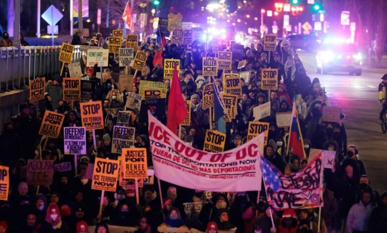 وتجمع مئات المحتجين في واشنطن ومدن أصغر مثل آشفيل بولاية نورث كارولاينا، حيث نظموا مسيرات في وسط المدينة وظهروا في مقاطع مصورة نُشرت على الإنترنت وهم يهتفون “لا لإدارة الهجرة والجمارك.. لا لجماعة كو كلوكس كلان.. لا للفاشية الأميركية”.