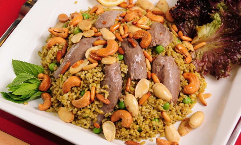 – في صحن التقديم اسكبوا الفريكة وضعوا عليها لحم الموزات المسلوق وزينوها بالمكسرات.