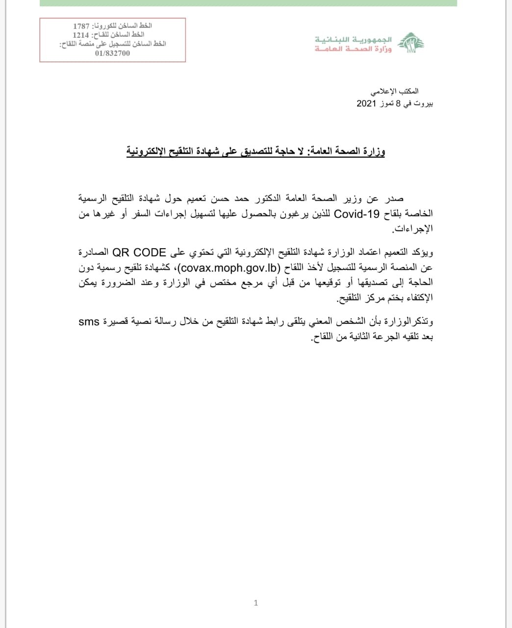 واكد التعميم “اعتماد الوزارة شهادة التلقيح الإلكترونية التي تحتوي على QR CODE الصادرة عن المنصة الرسمية للتسجيل لأخذ اللقاح (covax.moph.gov.lb)، كشهادة تلقيح رسمية دون الحاجة إلى تصديقها أو توقيعها من قبل أي مرجع مختص في الوزارة وعند الضرورة يمكن الإكتفاء بختم مركز التلقيح”.