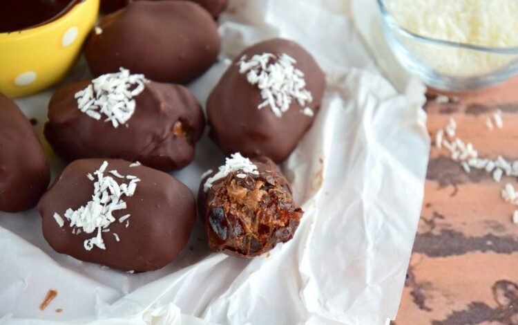 الخطوة 2: نذوّب نوع الشوكولا المفضّلة لدينا ونغلّف بها حبّات التمر المحشوّة ونزينها بفتات البسكويت ثمّ ندخلها إلى البرّاد لتتجمّد.