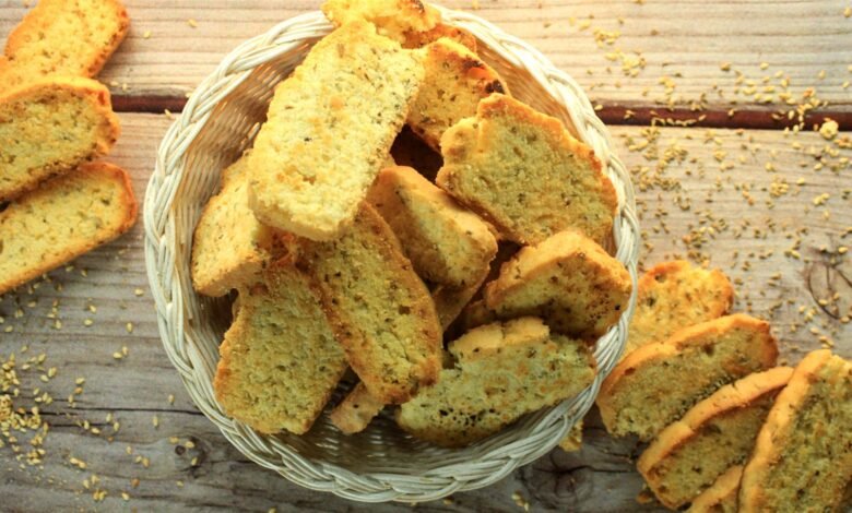 أعيدوا البسكويت الى الفرن لمدة 5 دقائق بعد تقطيعها حتى تتحمر من الطرف الثاني. وبذلك تصبح جاهزة للتقديم .
