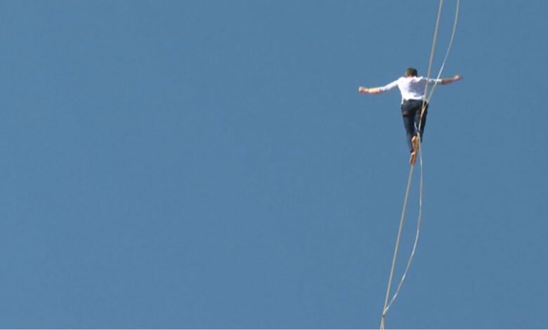 مغامر فرنسي يحقق رقماً قياسياً في المشي على حبل بين قمتين..