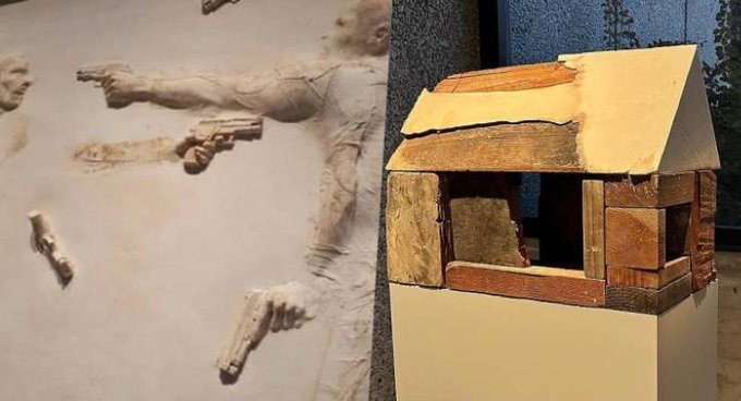 من بين أعمال بيت التسعة التي يعرضه في المتحف هو هيكل على شكل منزل مصبوب في السيليكون ، مع الرصاص يصور مشهد اطلاق النار، ومن المثير للاهتمام أن الفائز بجائزة الأوسكار بدأ هواية صنع فن النحت بعد طلاقه من أنجلينا جولي في عام 2017 .