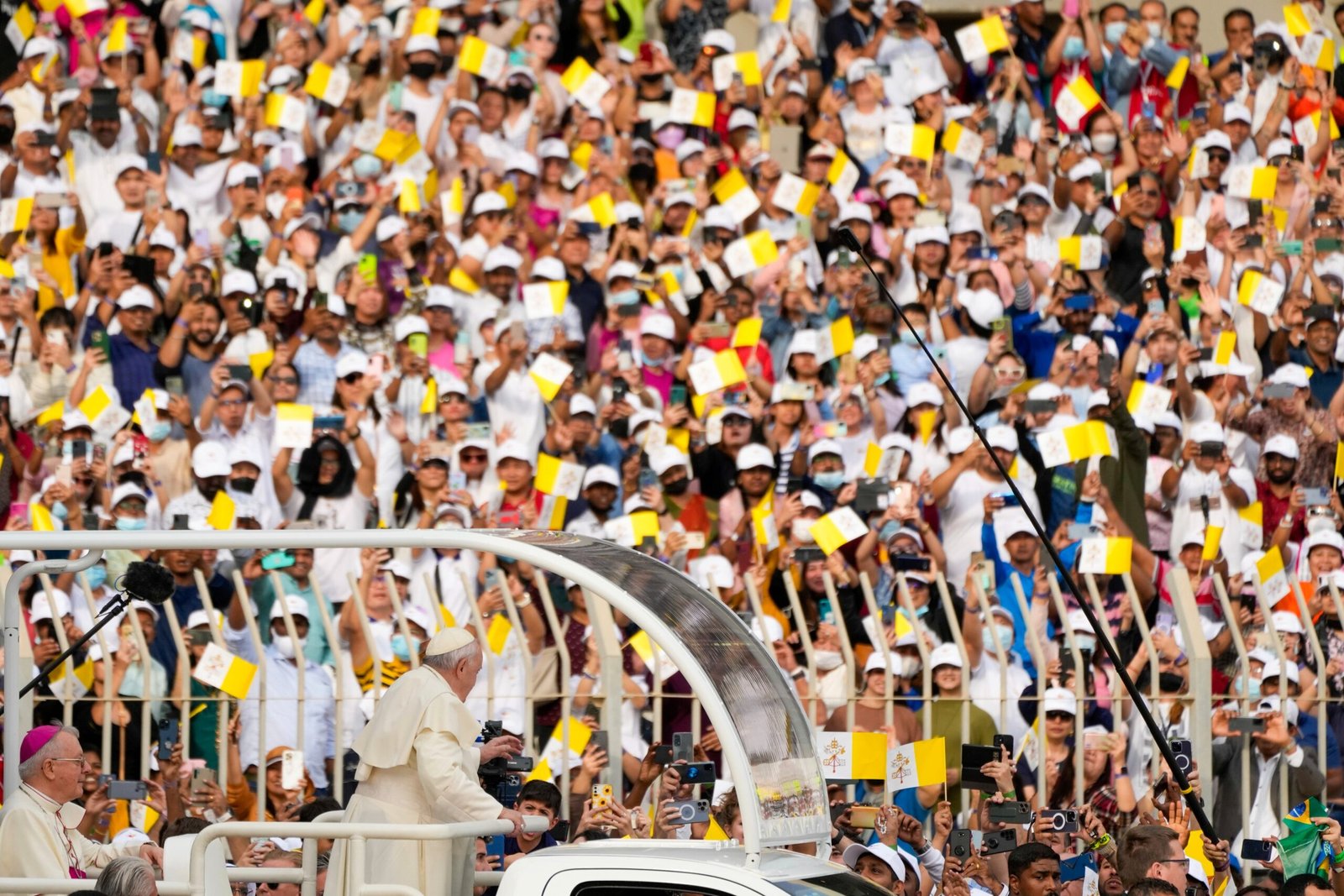 والقداس اليوم هو ثاني محطة يلتقي فيها البابا فرنسيس المسيحيين الكاثوليك، بعد محطة أولى مساء الجمعة في كاتدرائية سيدة العرب، الكنيسة الكاثوليكية الأكبر في الخليج، التي دخلها على وقع التصفيق والدموع.