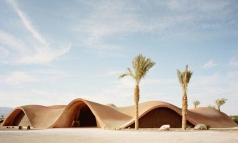 * يحاكي نادي الغولف «آيلا»، من تصميم المعماري تشاد أوبنهايم، بمدينة العقبة الأردنية، منظر الكثيب الرملي، حيث يذوب شكله المقوّس وغير المتساوي في المنظر الطبيعي الصحراوي ويميل إلى الجيولوجيا أكثر من العمارة.