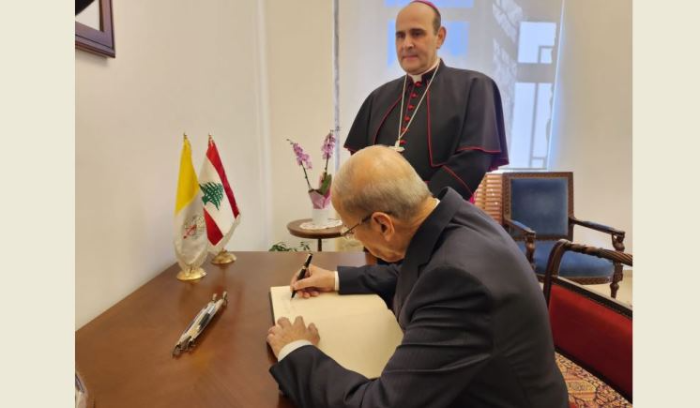 AOUN PRÉSENTE SES CONDOLÉANCES POUR LA MORT DU PAPE ÉMÉRITE BENOÎT XVI À LA NONCIATURE APOSTOLIQUE