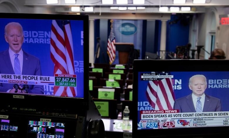 ووفقاً لمعظم شبكات التلفزيون الكبرى، حصل بايدن على 253 صوتاً في المجمع الانتخابي الذي يحدد الفائز في الانتخابات مقابل 214 صوتاً لترامب ويتقدم في أربع ولايات متأرجحة لا يزال فرز الأصوات مستمرا بها، متجهاً صوب تأمين 270 صوتاً هي المطلوبة للفوز.