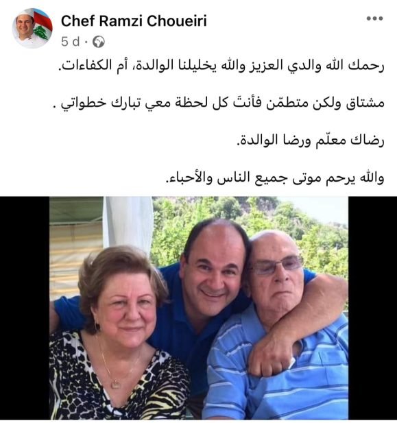 وكان الراحل الشيف رمزي قد نشر على حسابه عبر فيسبوك في أيامه الأخيرة، صورة مع عائلته وأرفقها بالتعليق التالي: “رحمك الله والدي العزيز والله يخليلنا الوالدة، أم الكفاءات. مشتاق ولكن متطمّن فأنتَ كل لحظة معي تبارك خطواتي. رضاك معلّم ورضا الوالدة. والله يرحم موتى جميع الناس والأحباء”.