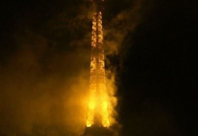 إلا أن الصورة الأولى تعود لمجسم خشبي للبرج أُحرق الشهر الماضي خلال احتفالات ناد فرنسي لكرة القدم، أما الثانية فتعود لأدخنة مفرقعات نارية في برج إيفل سنة 2005 خلال الاحتفال باليوم الوطني الفرنسي.