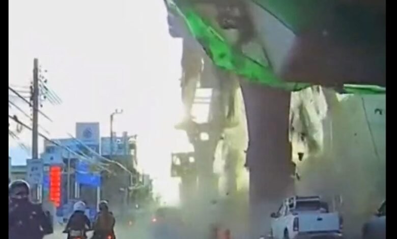 وقد حصل الحادث المروع عند انهيار أحد الجسور الضخمة في العاصمة التايلاندية بشكل مفاجئ على على السيارات ما أدى لوقوع خسائر بشرية ومادية.